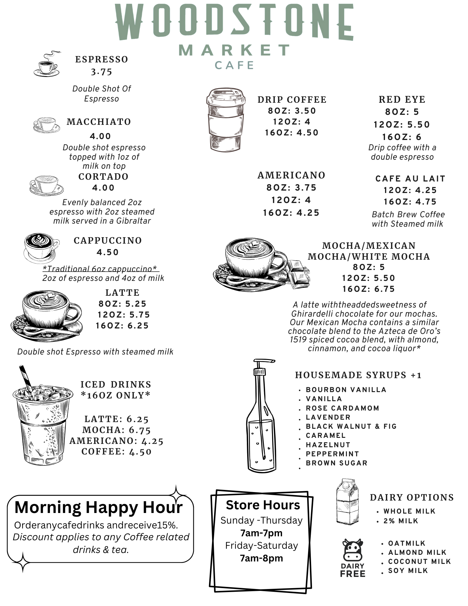 Espresso classics and drip coffee with house syrups and dairy-free options.