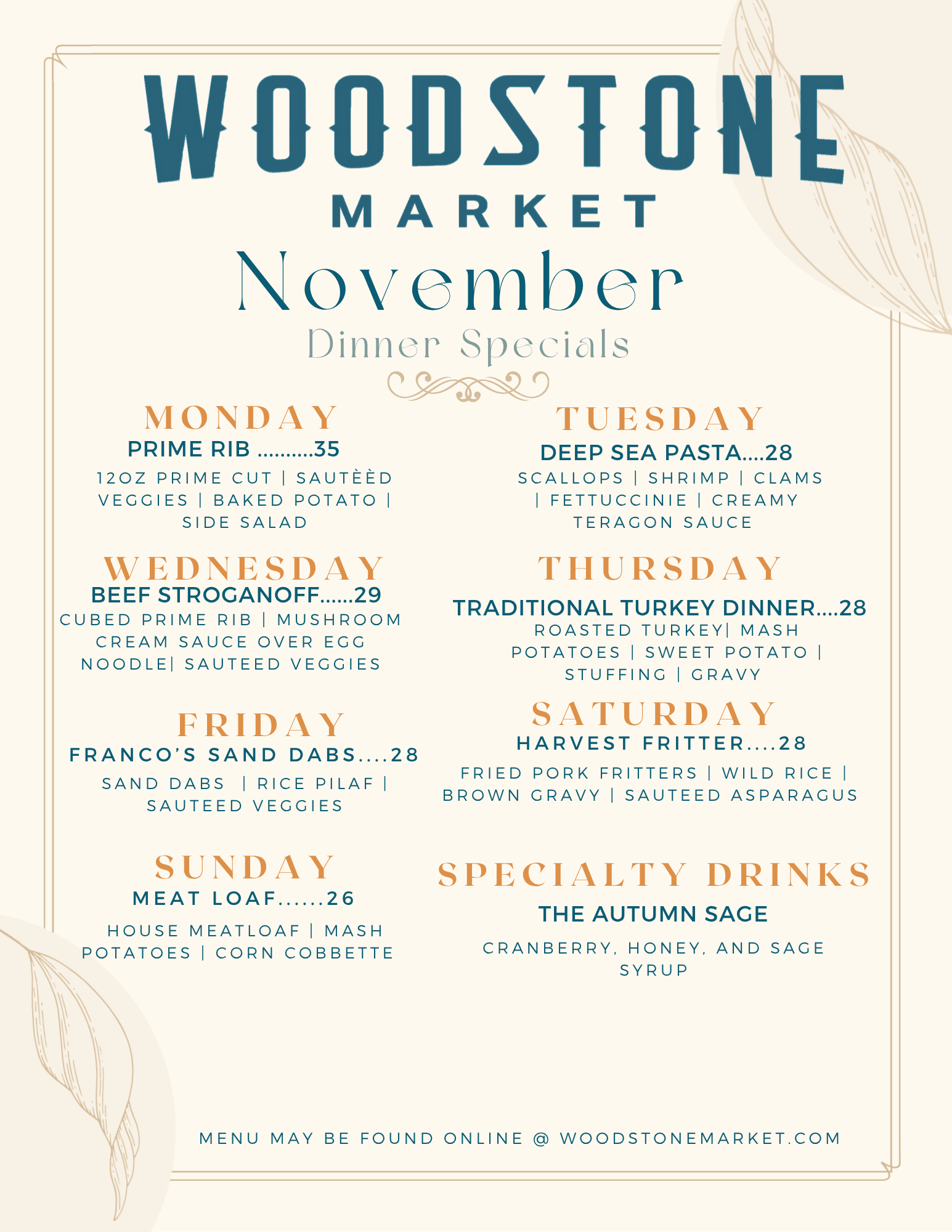 Nightly chef features—prime rib, fish, jambalaya, lasagna—and a rotating specialty drink.
